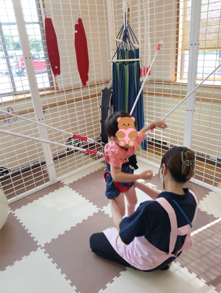 ハーネスでやさしく支えることで、立位を安定させることができます。腕や足の運動、ストレッチを通して、固有覚(関節や筋肉の感覚)や前庭覚を刺激します。自分の身体の動きを感じることが出来ます。